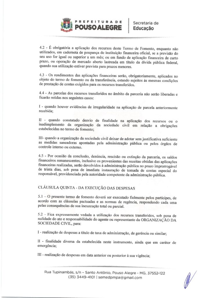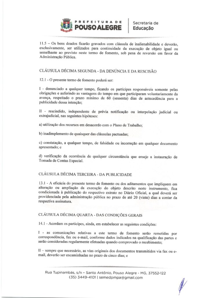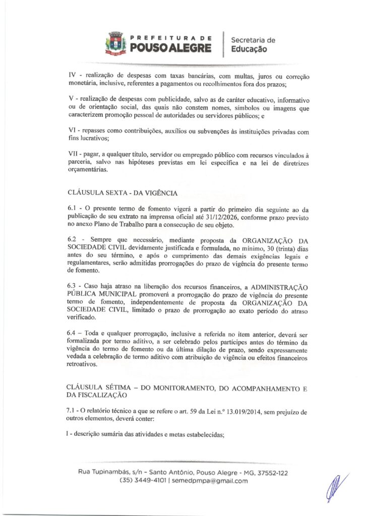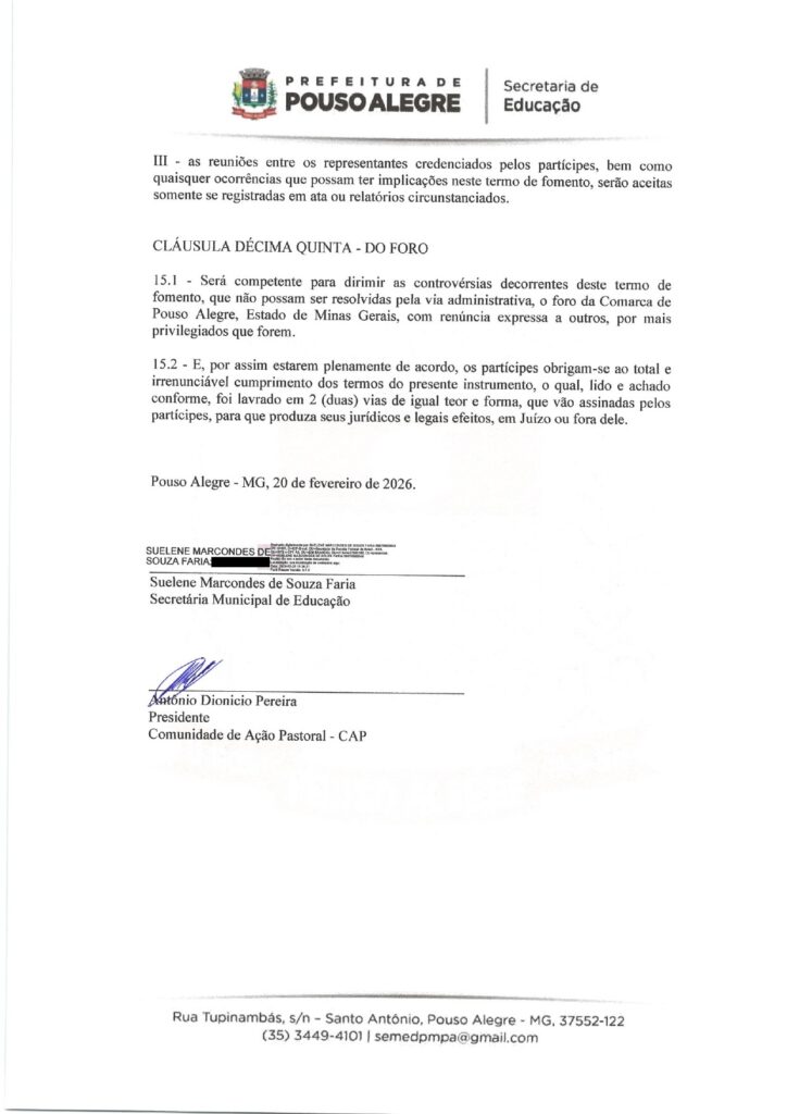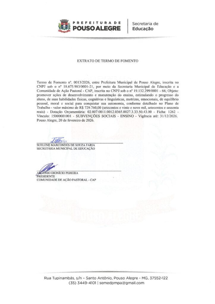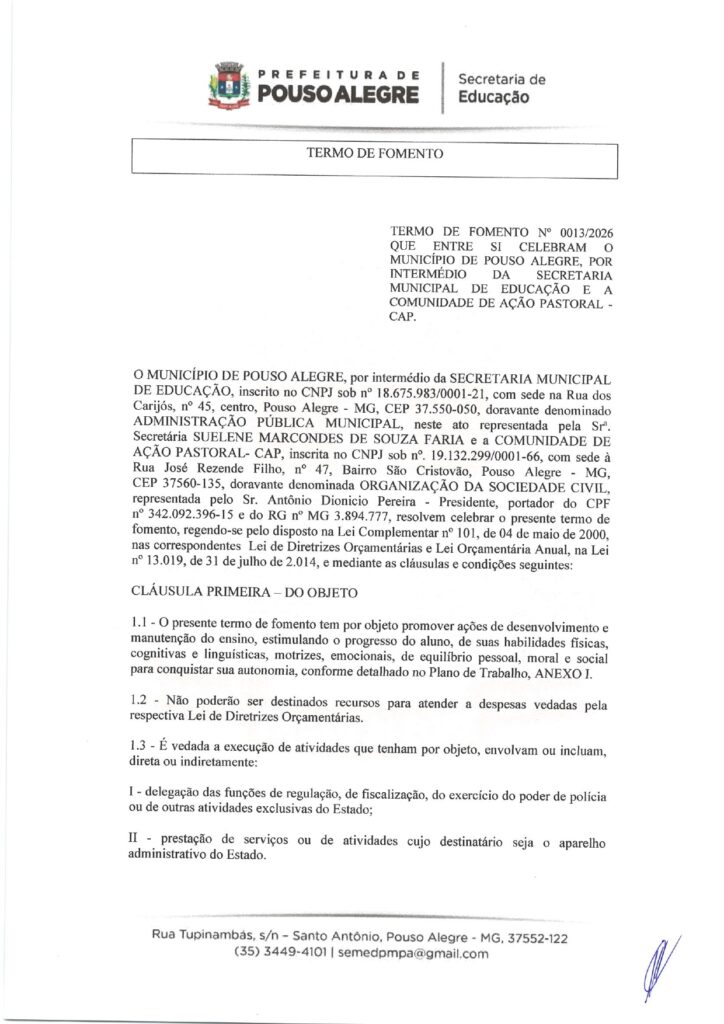 EDUCAÇÃO – TERMO DE FOMENTO nº 0013/2026, celebrado com o Município de Pouso Alegre (Secretaria Municipal de Educação).